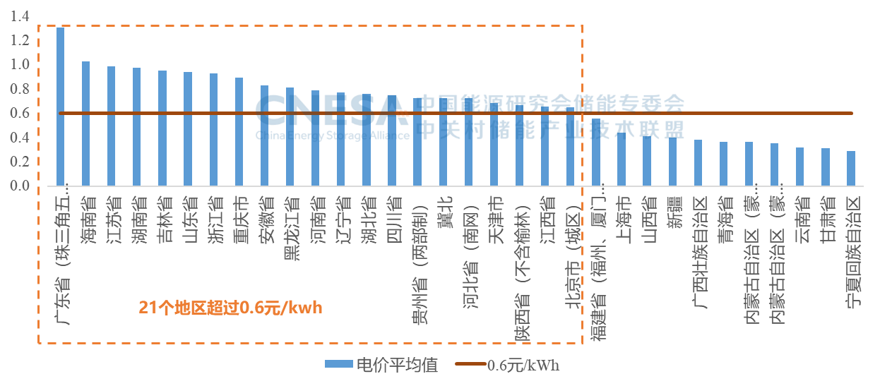 峰谷電價方面,2024年,32個地區最大峰谷價差的總體平均值為0.68元/kWh,同比-6.1%。對經濟性保守測算下,按0.6元/kWh為收益邊界,21個地區滿足價差要求。