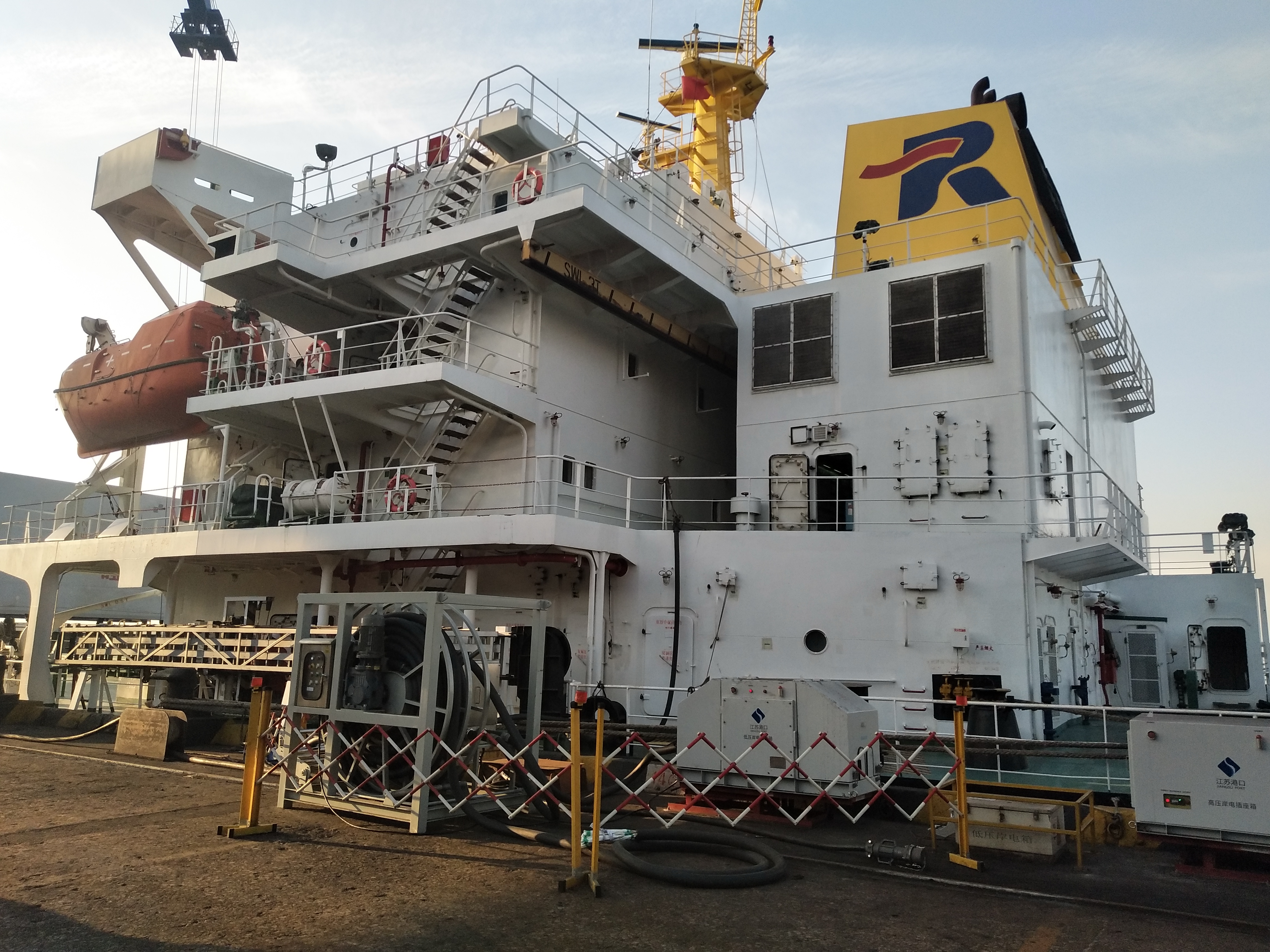 “長(zhǎng)春門”輪船載重51000噸,船舶發(fā)電機(jī)560kW,需在南京新生圩碼頭靠泊作業(yè)40小時(shí)。據(jù)測(cè)算,船舶岸電系統(tǒng)與“長(zhǎng)春門”輪于117日上午8點(diǎn)24分成功解列后,該輪靠港期間共使用岸電42小時(shí),消耗電能7000千瓦時(shí),可替代柴油2.5噸,減排二氧化碳近0.5噸。由此可見,岸電系統(tǒng)的使用不僅減少了燃料的消耗,且大大降低了靠港期間的污染物排放量。
